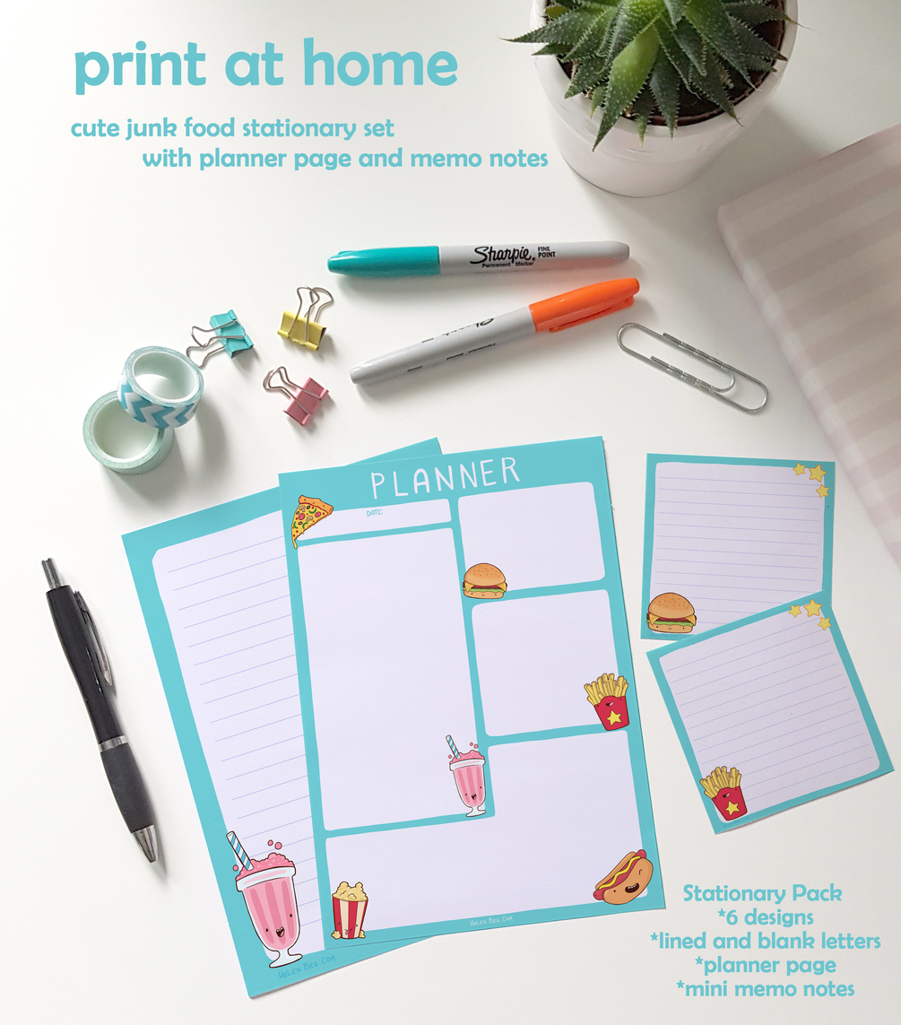 Print this cute junk food themed stationary pack at home. This package includes files to download and print: An A5 planner sheet, A5 letter sheets both lined and blank plus a set of 9x9cm memo notes featuring 6 fast food inspired designs. Also includes an a5 sheet of stars to print on sticker paper to mark off tasks on your planner!